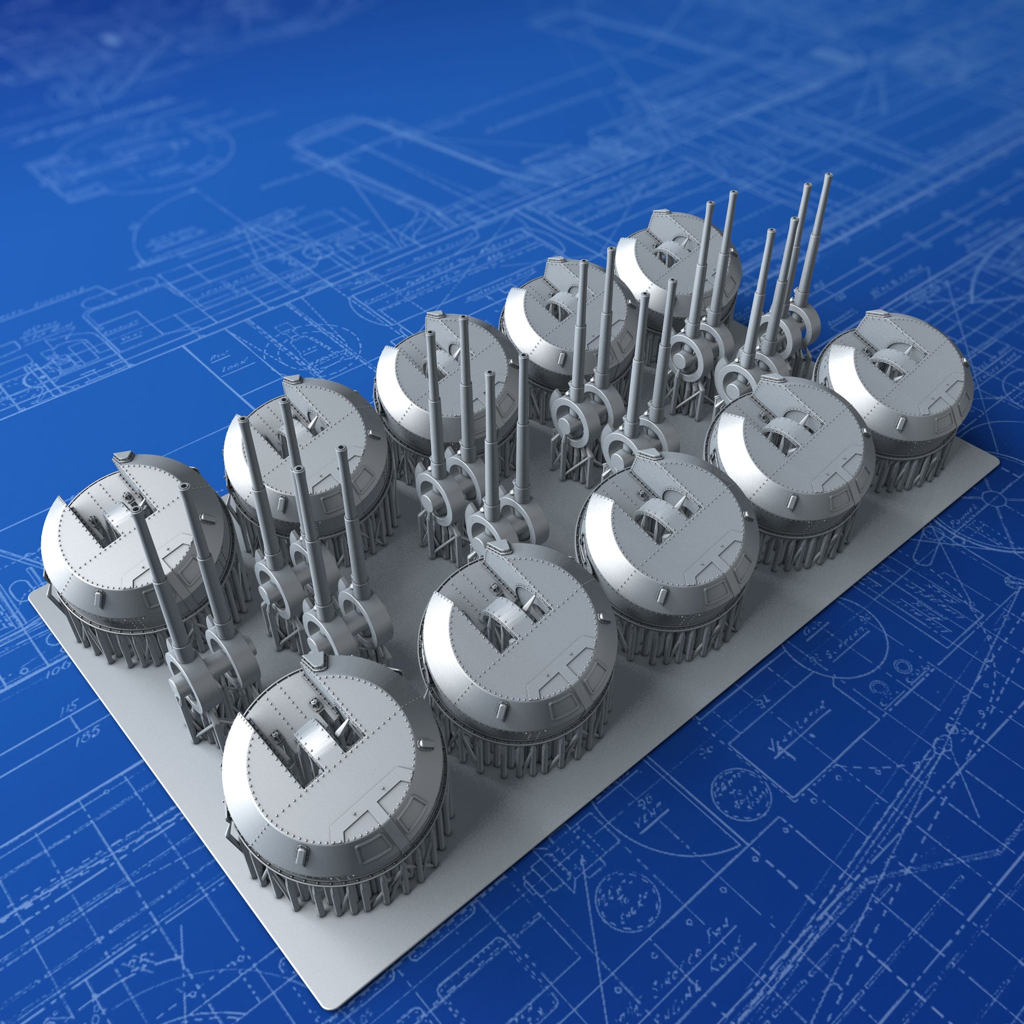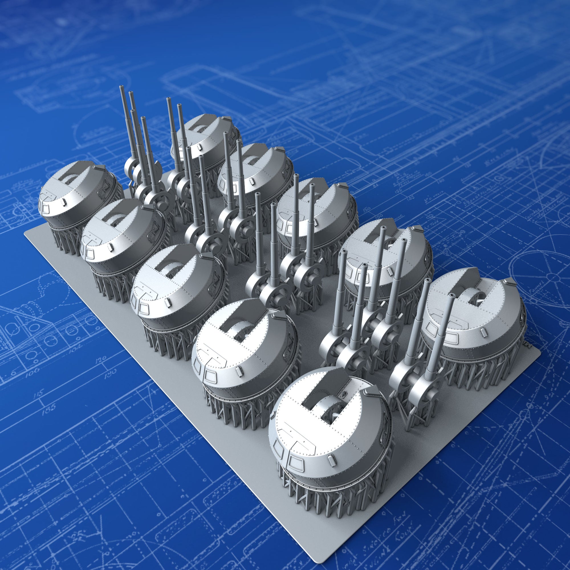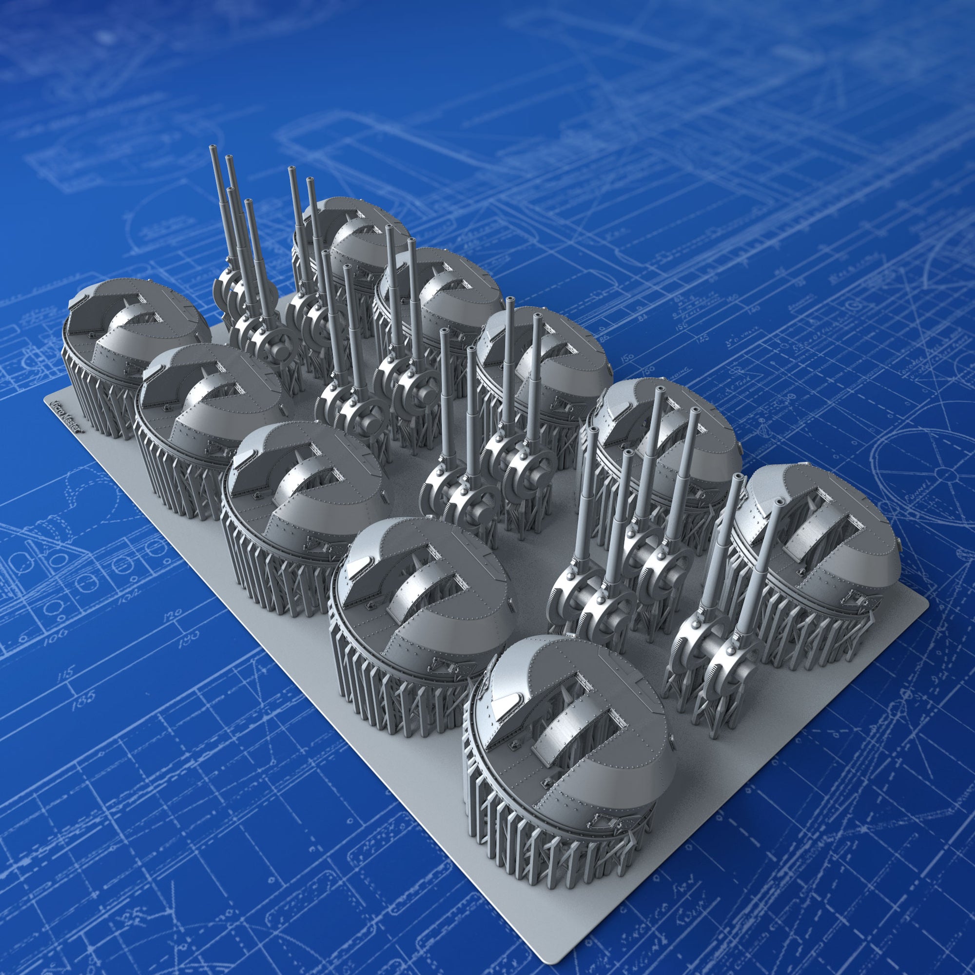 1/200 Scale Royal Navy 4.5"/45 (11.4cm) MKII BD x10 as used by the Royal Navy and Allied Navies on HMS Queen Elizabeth, HMS Valiant and HMS Renown. These are highly detailed parts modelled using plans and many reference photographs.