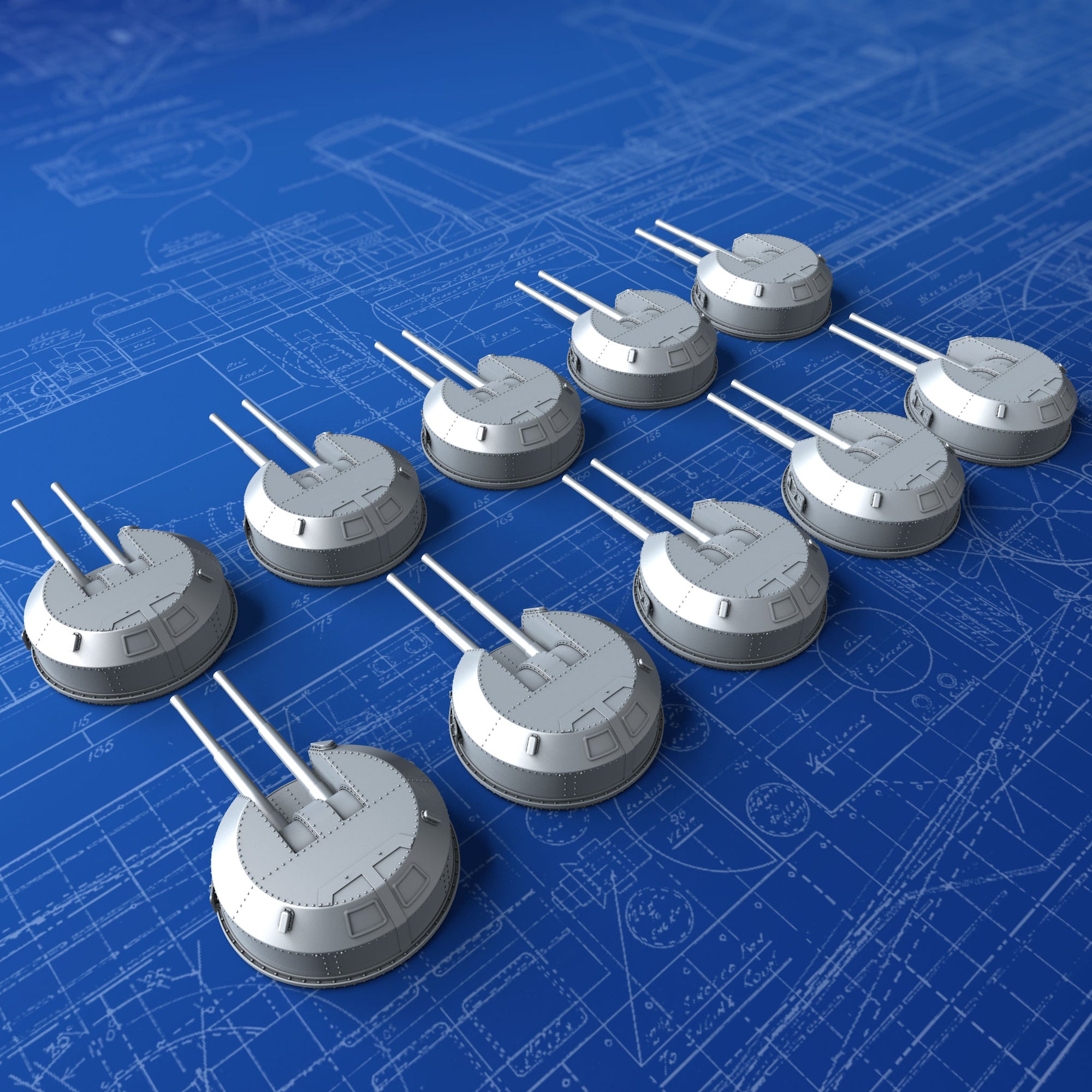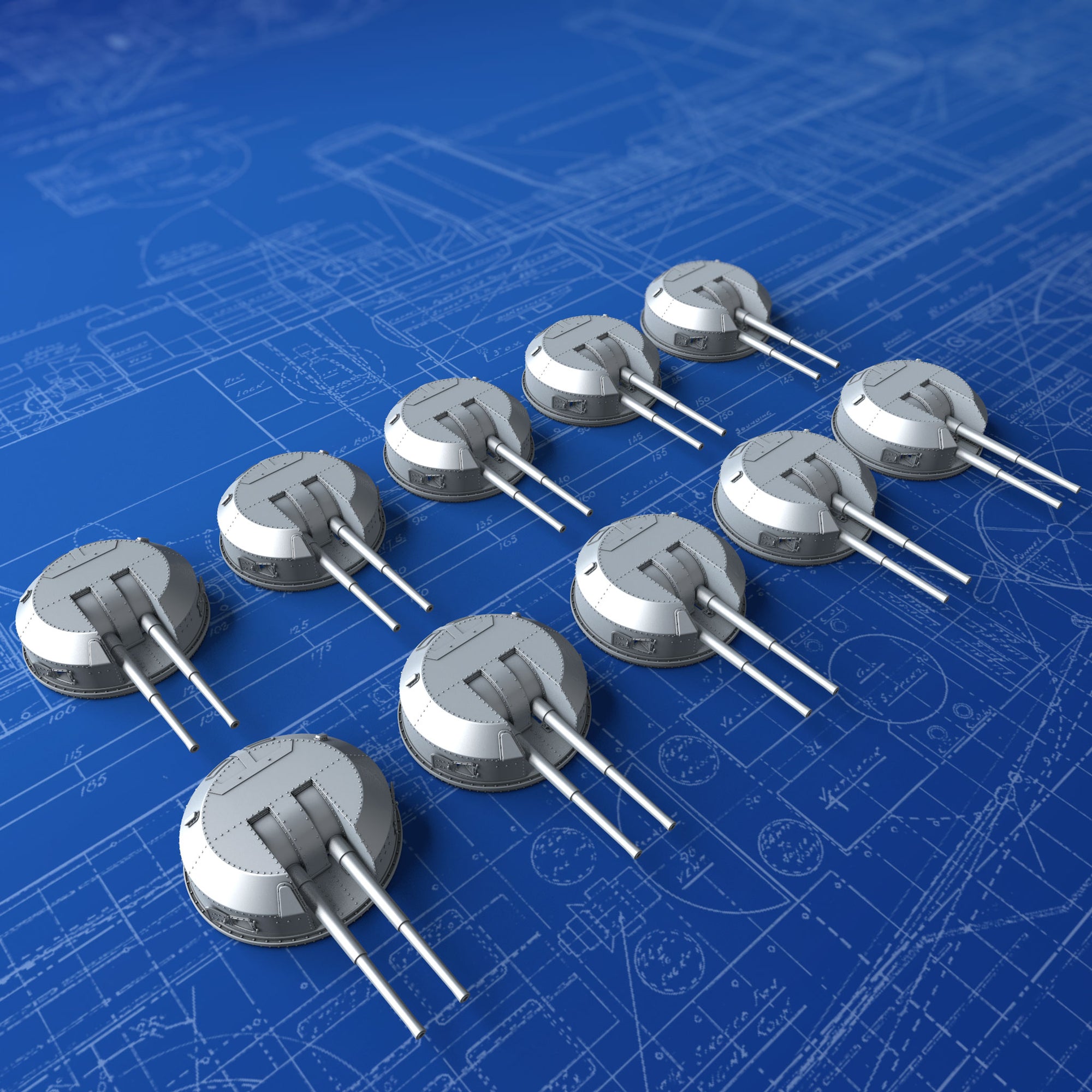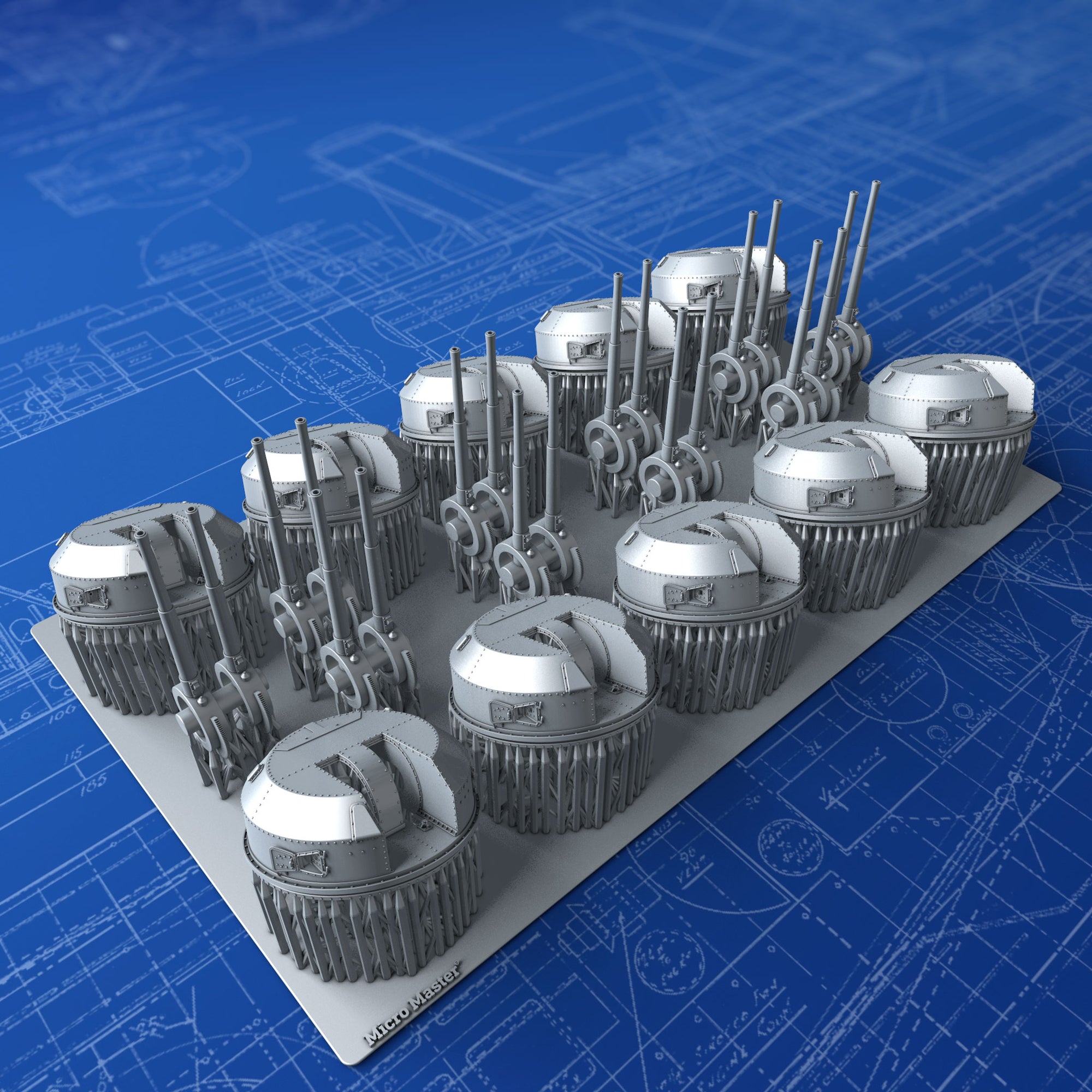 1/200 Scale Royal Navy 4.5"/45 (11.4cm) MKII BD x10 as used by the Royal Navy and Allied Navies on HMS Queen Elizabeth, HMS Valiant and HMS Renown. These are highly detailed parts modelled using plans and many reference photographs.