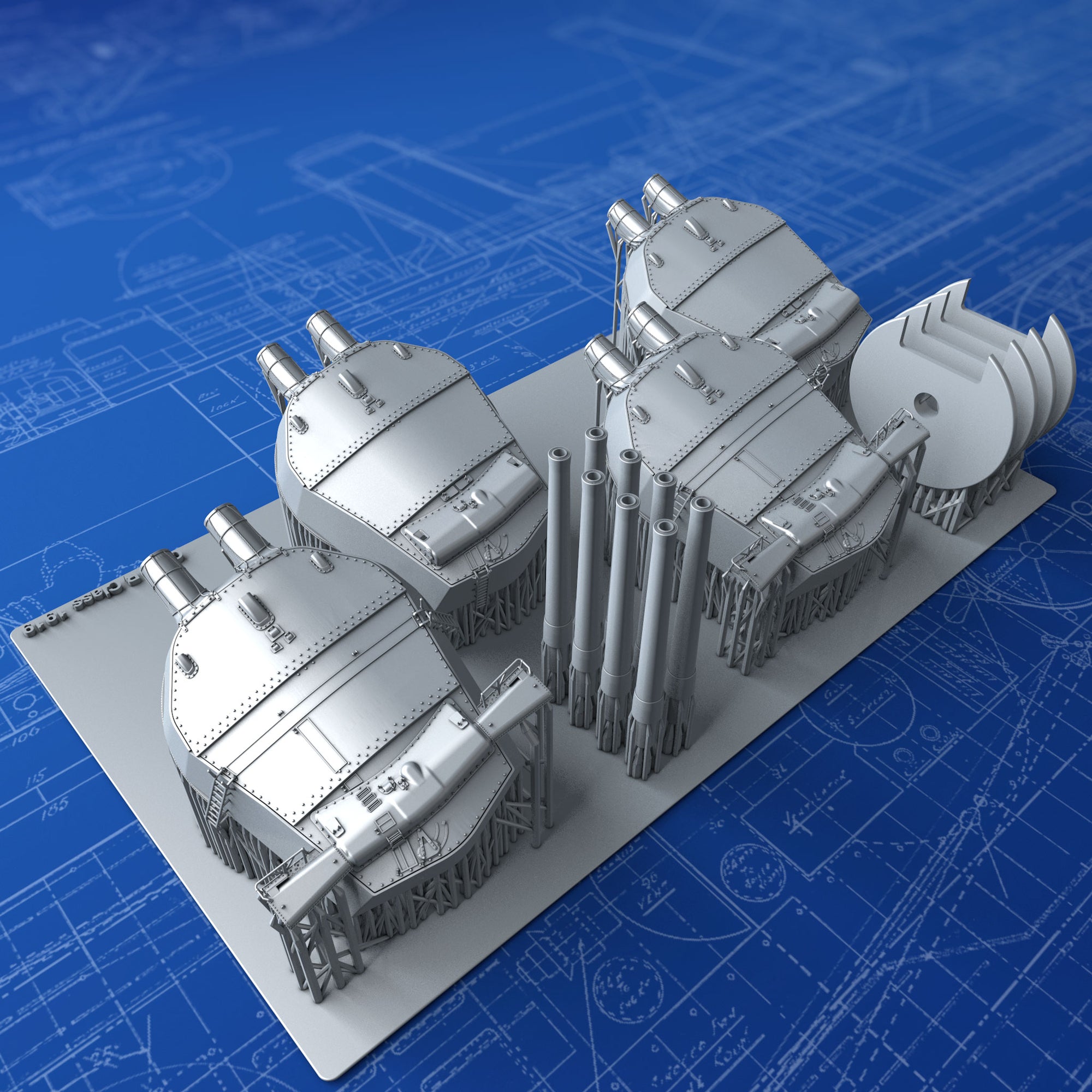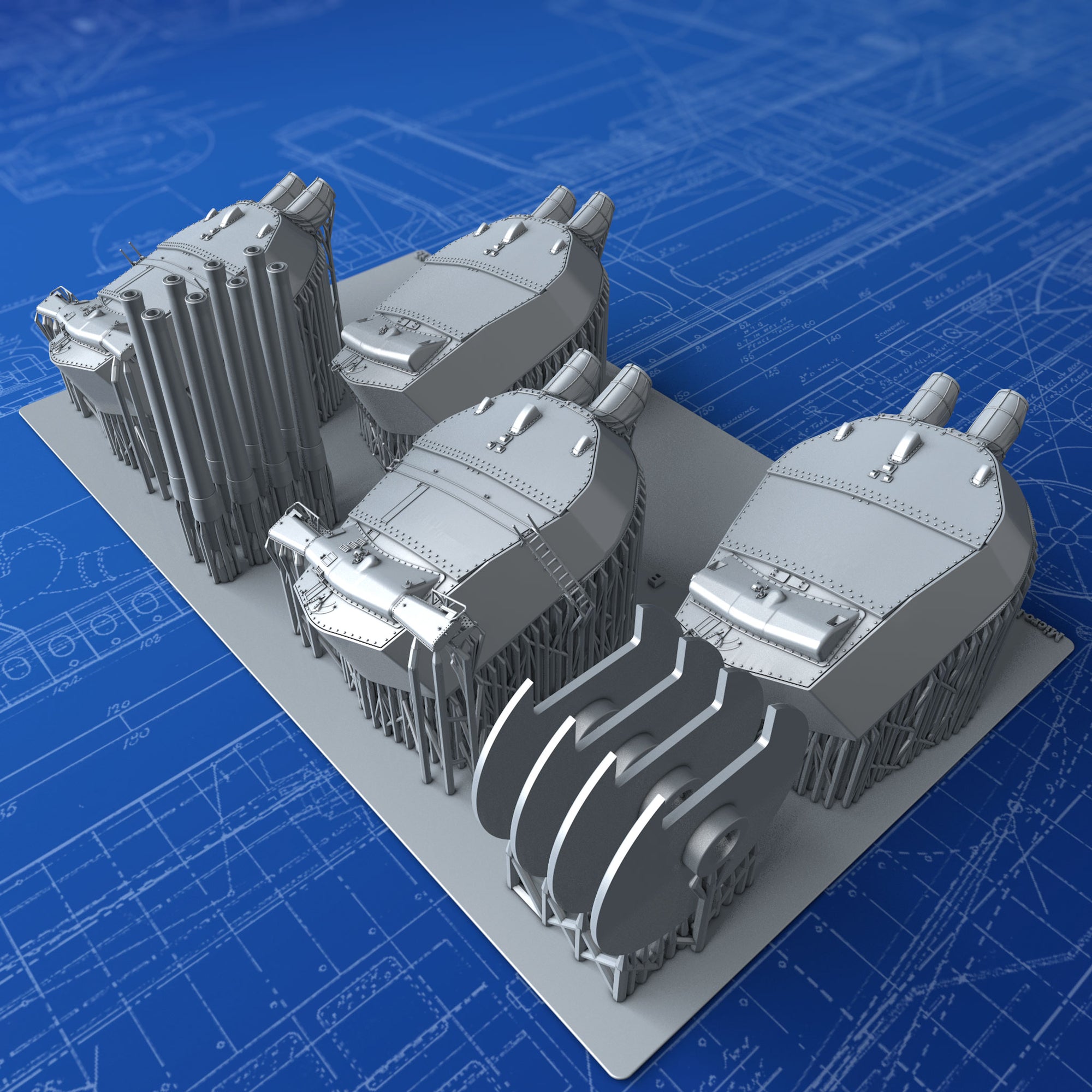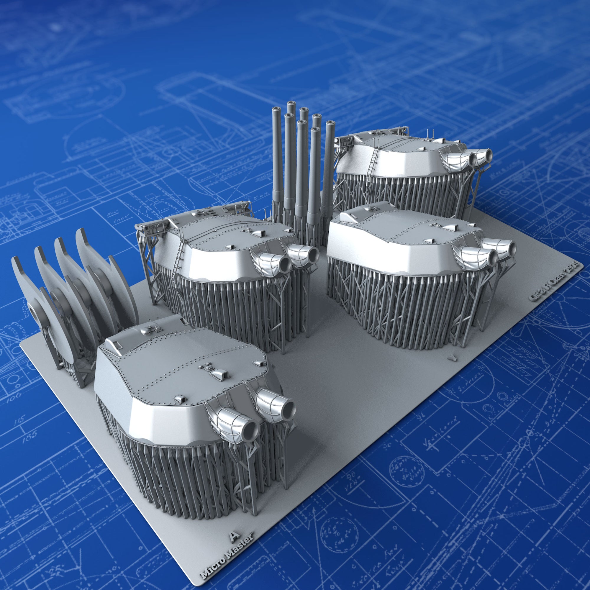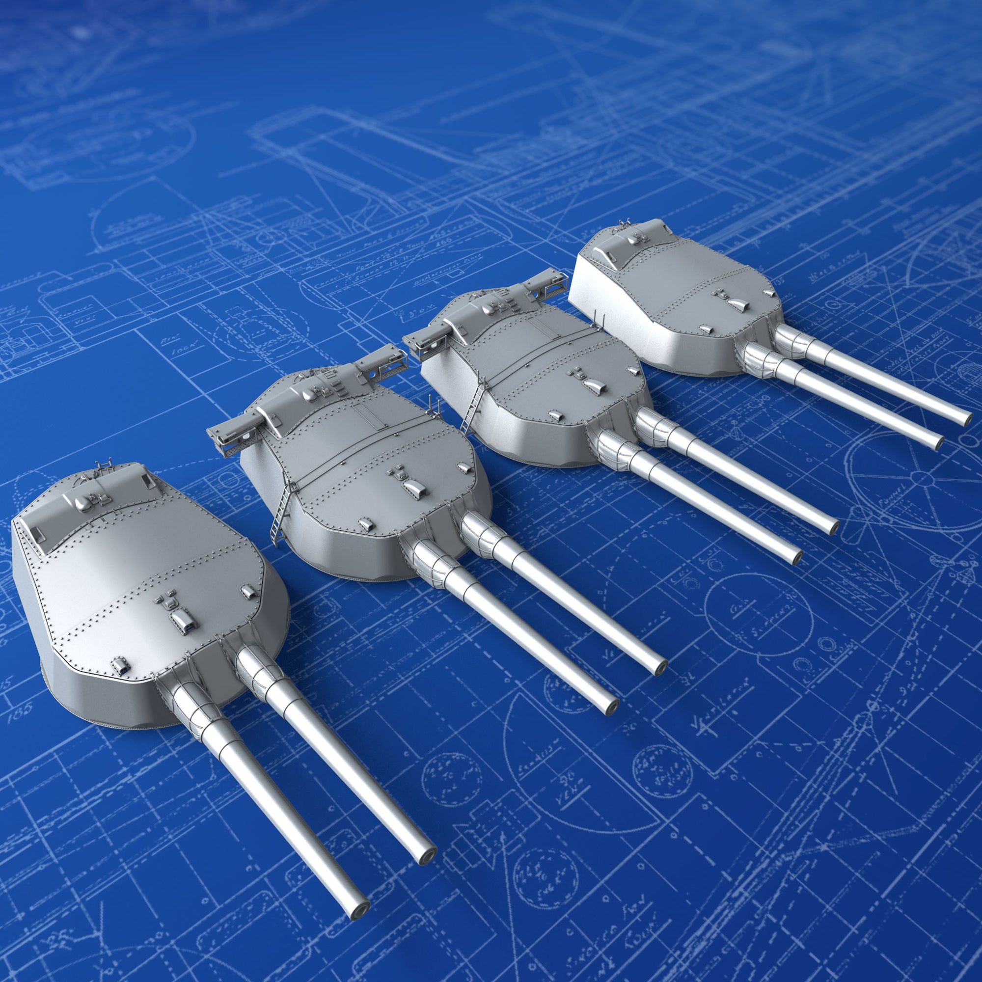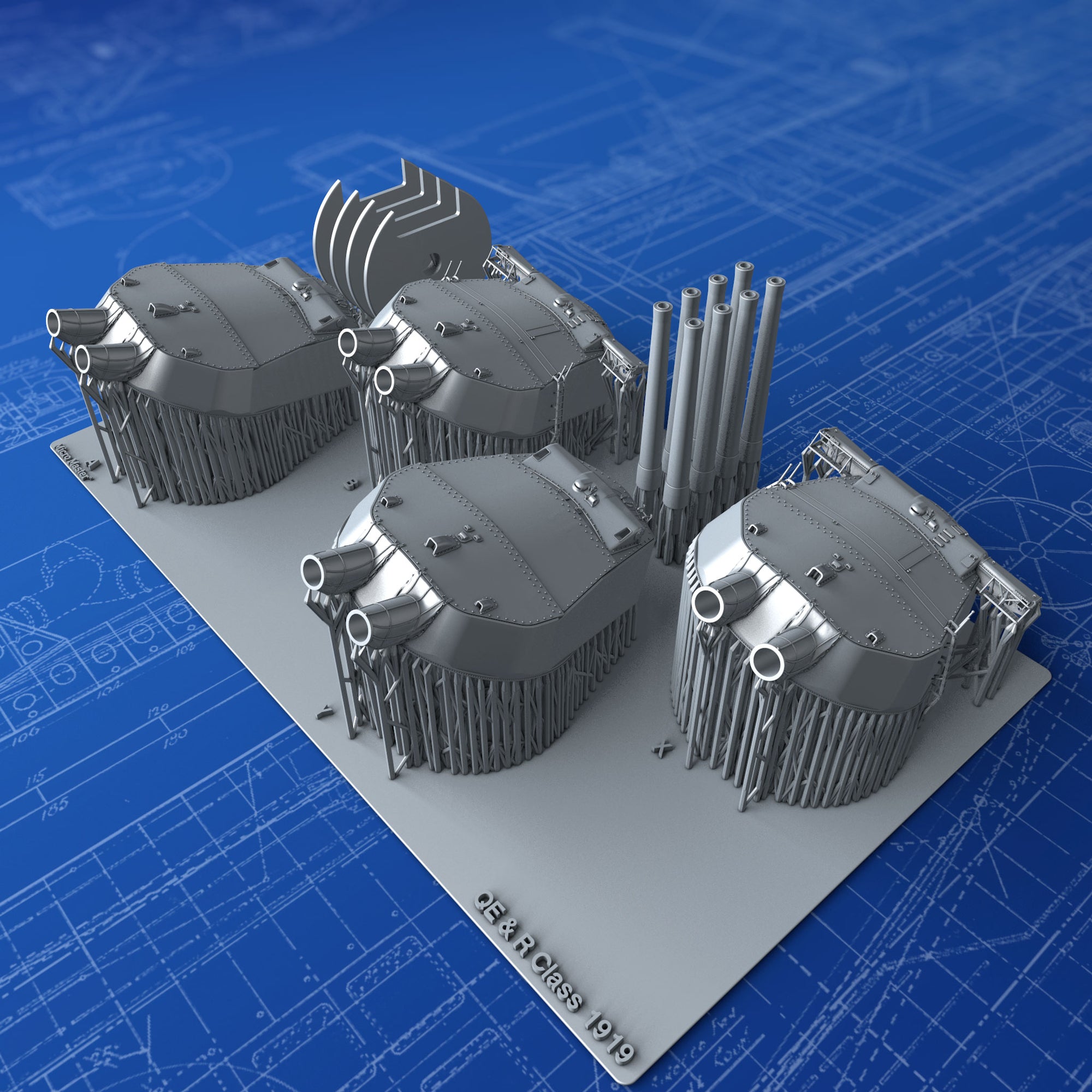 1/350 Scale Royal Navy 15" (38.1cm) MKI Turrets x4 with Blast Bags as used on Queen Elizabeth and Revenge Class battleships after the 30ft Rangefinders were added to B and X Turrets post-war 1919. These parts are modelled from the Robert Brown Battleship Warspite book plans and many reference photographs. Barrels are set at an elevation of 3º. Ideal replacements for the poor Turrets in the 1/350 Trumpeter Royal Oak Kit and other Queen Elizabeth & 'R' Class Kits.