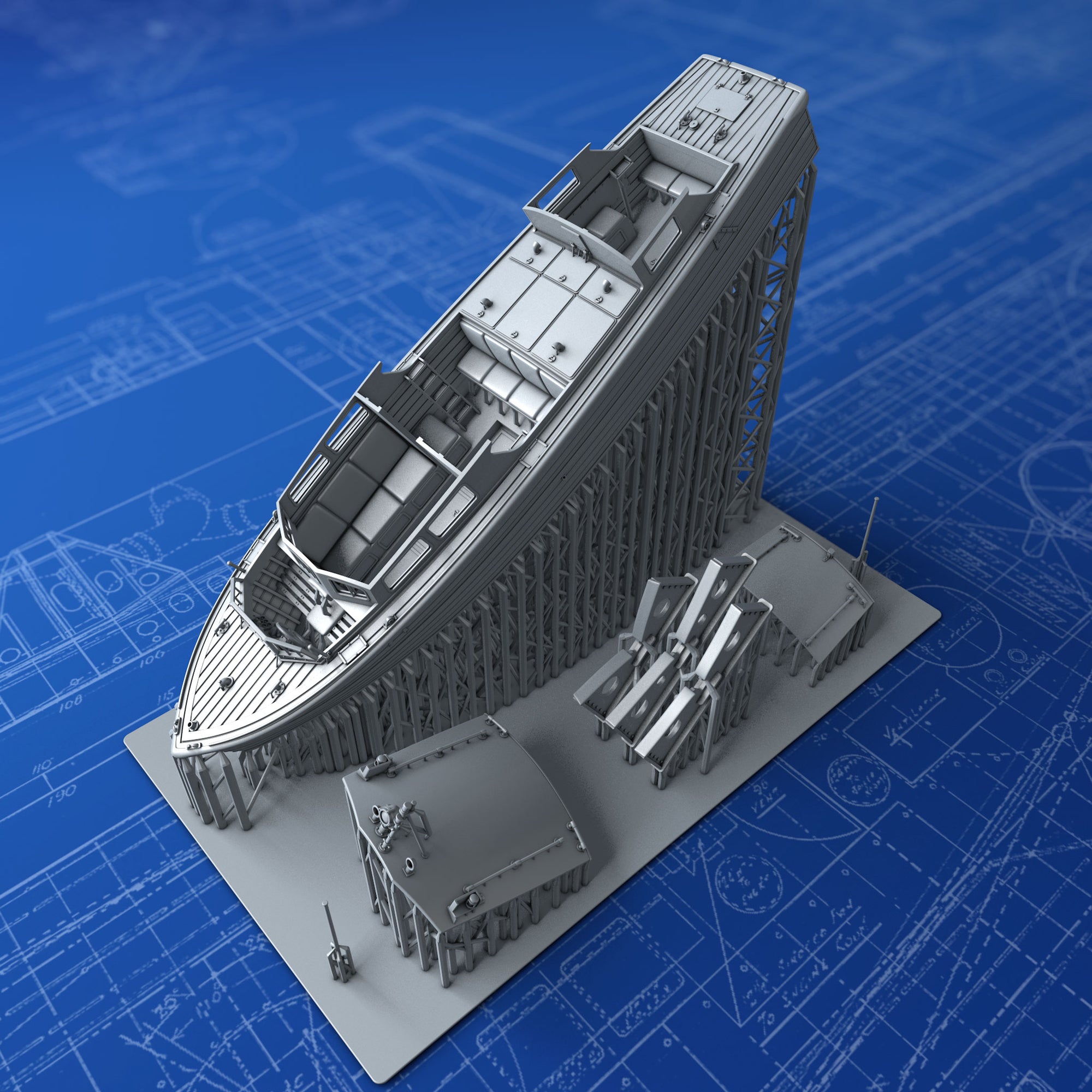 - Details include: Fairleads, Handrails, Rubbing Timber, Decking, Detailed Cockpit & Passenger Cabin, Jackstaffs, Rudders with Steering Mechanism, Propeller and Navigation Lights