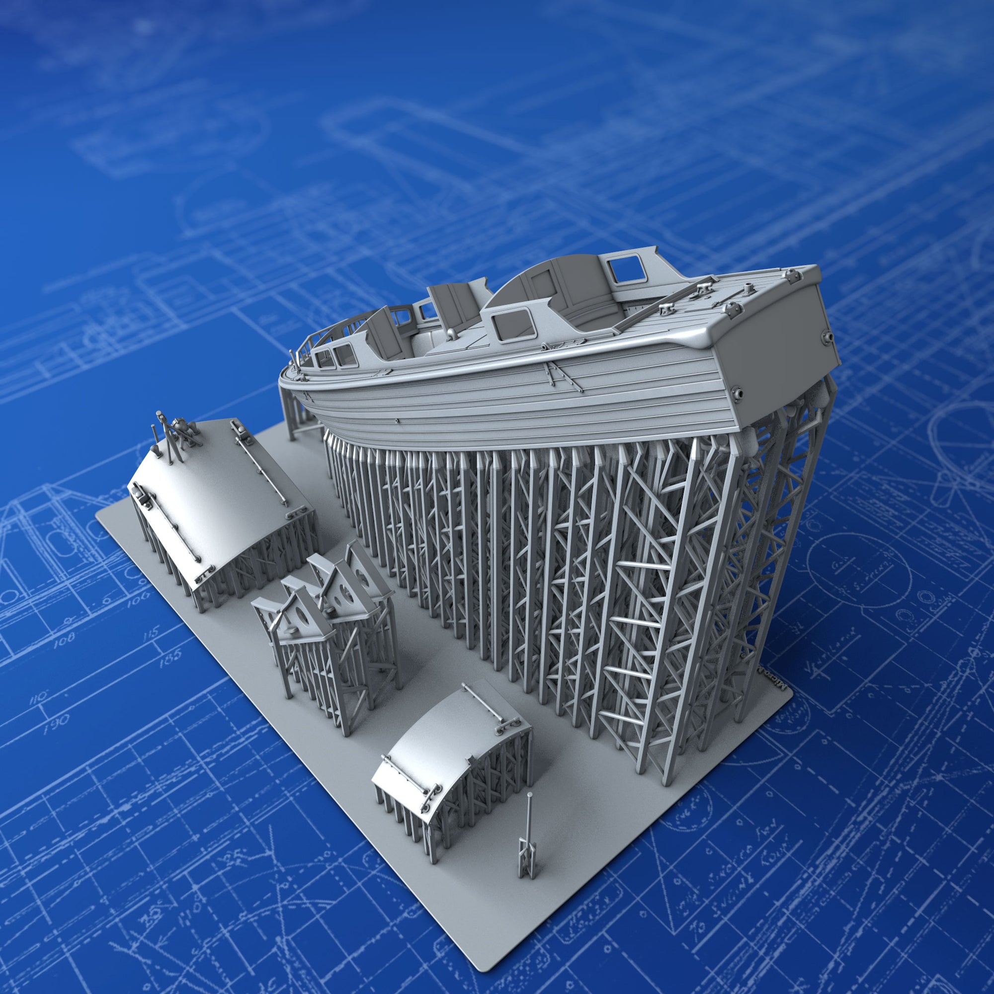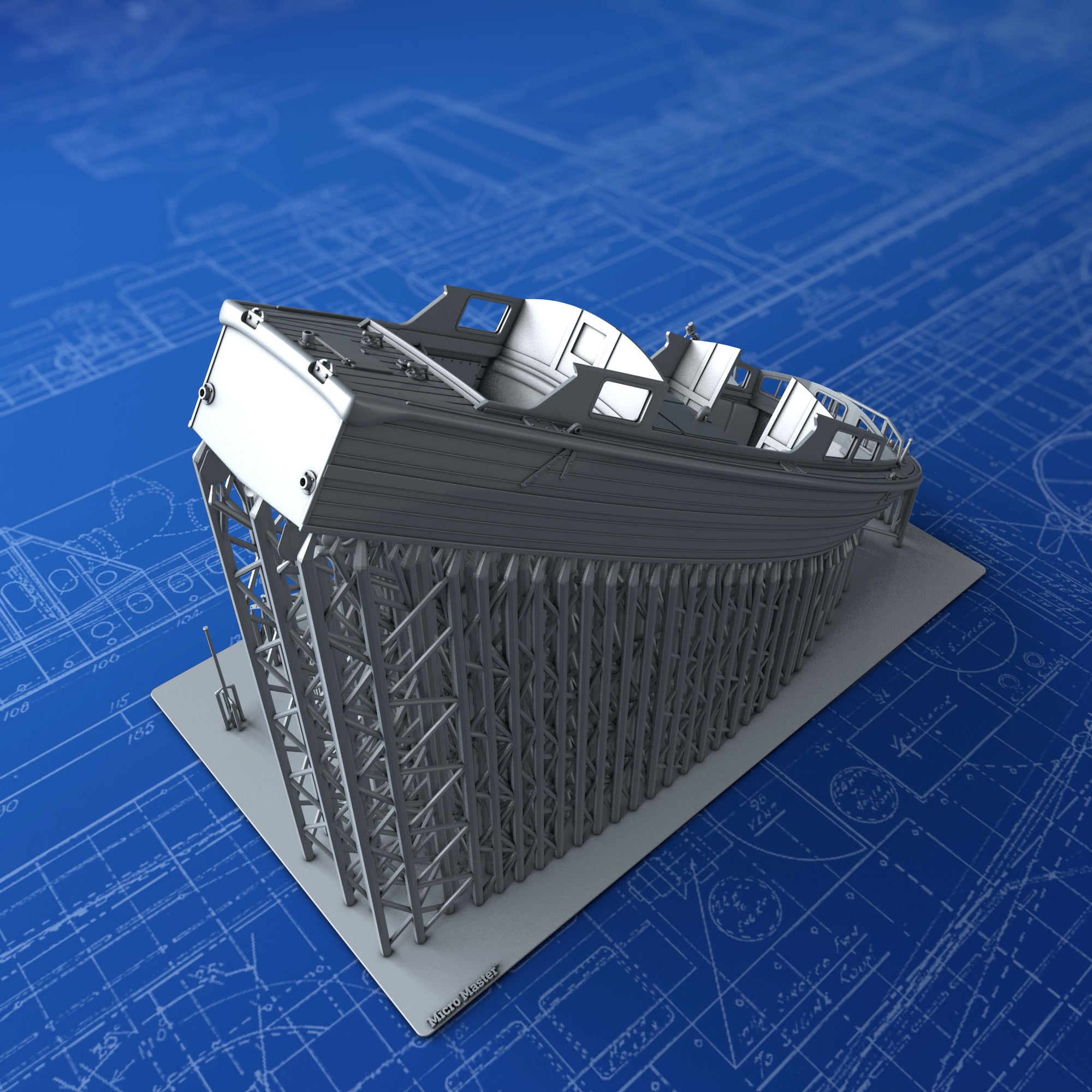 1/96 Scale Royal Navy 35ft Fast Motor Boat complete with Cradles. Modelled from plans and photographic reference taken at Portsmouth Historic Dockyards Boatshed 4. Used on a wide variety of Royal & Commonwealth Navy warships in WW2 including HMS Hood, Town Class & Leander Class Cruisers.
