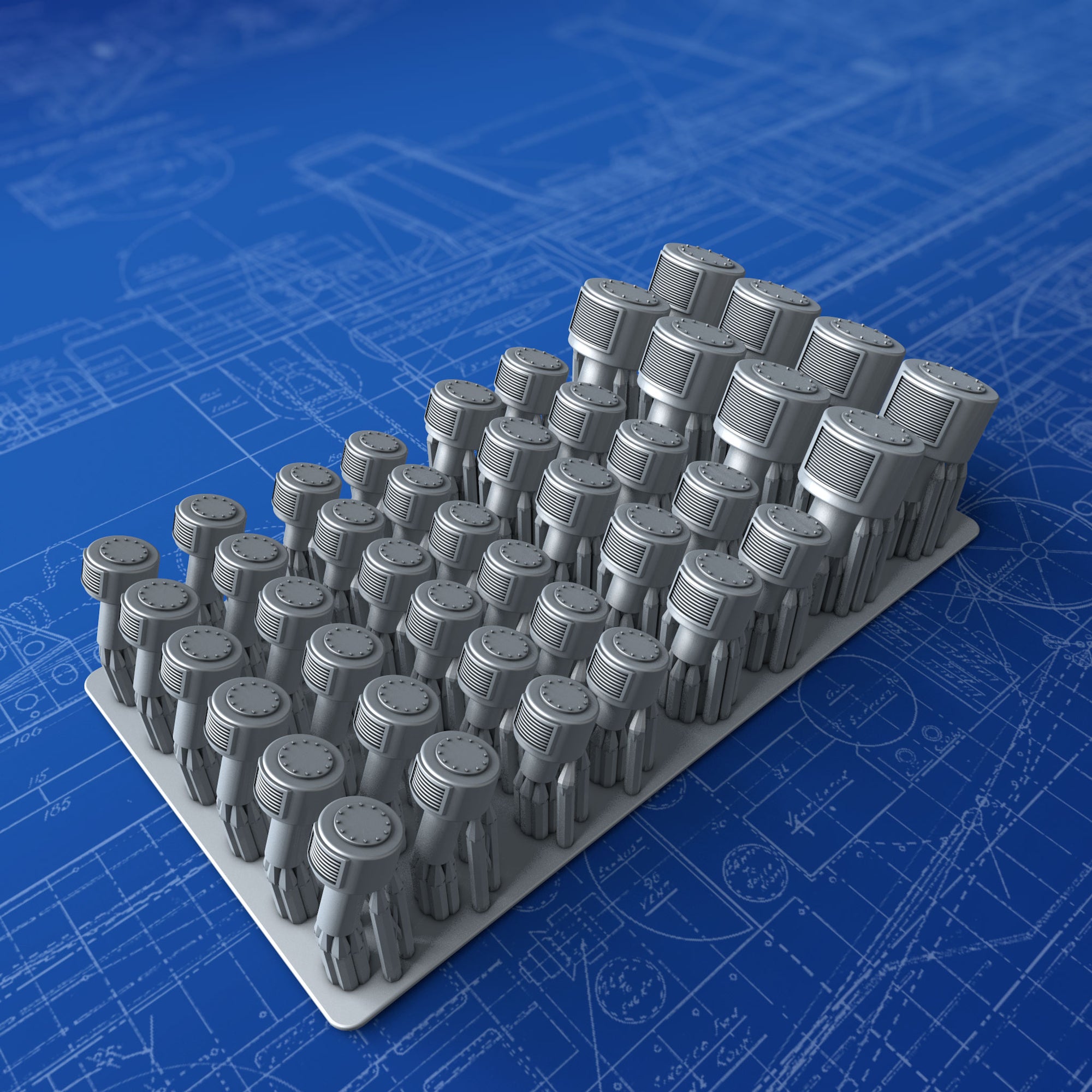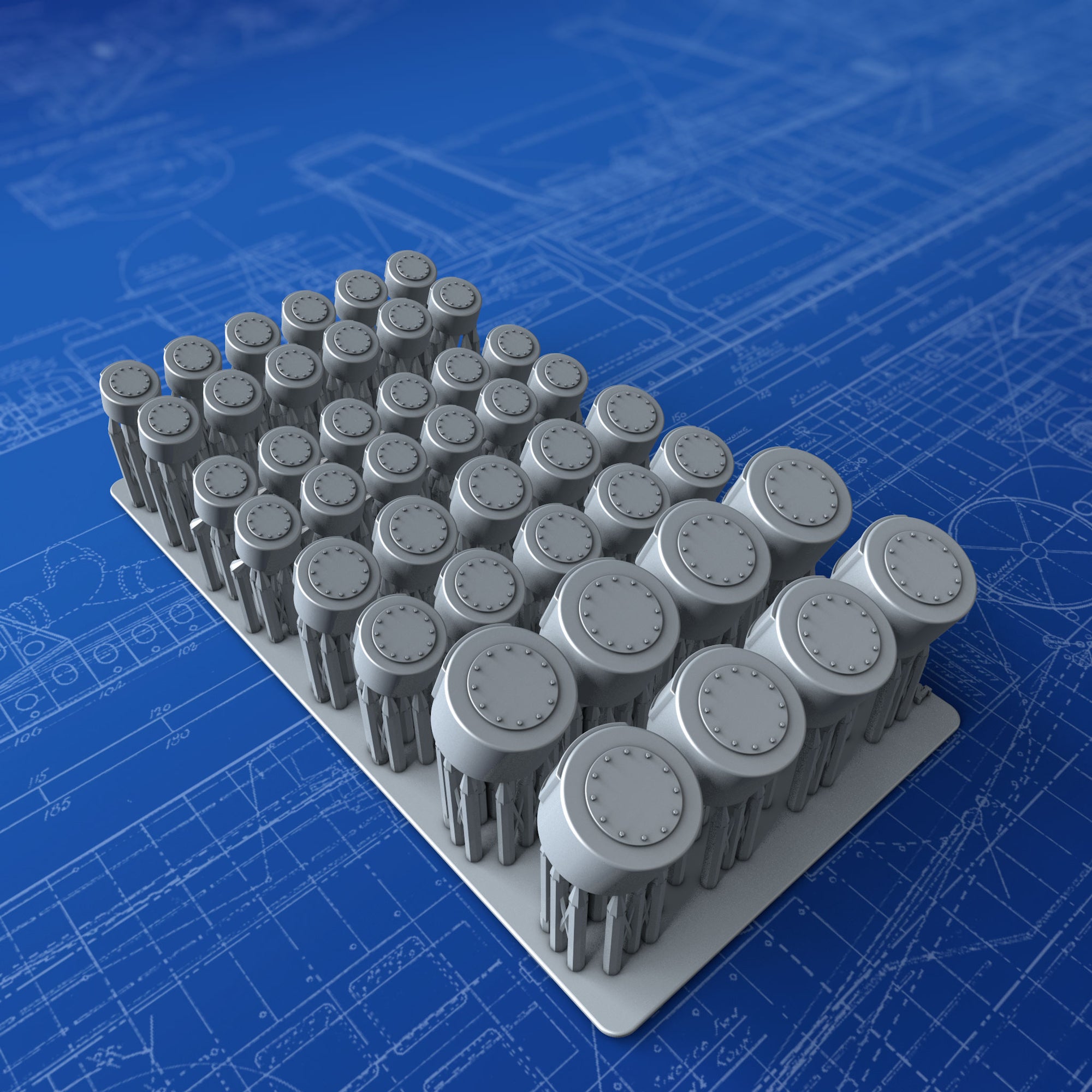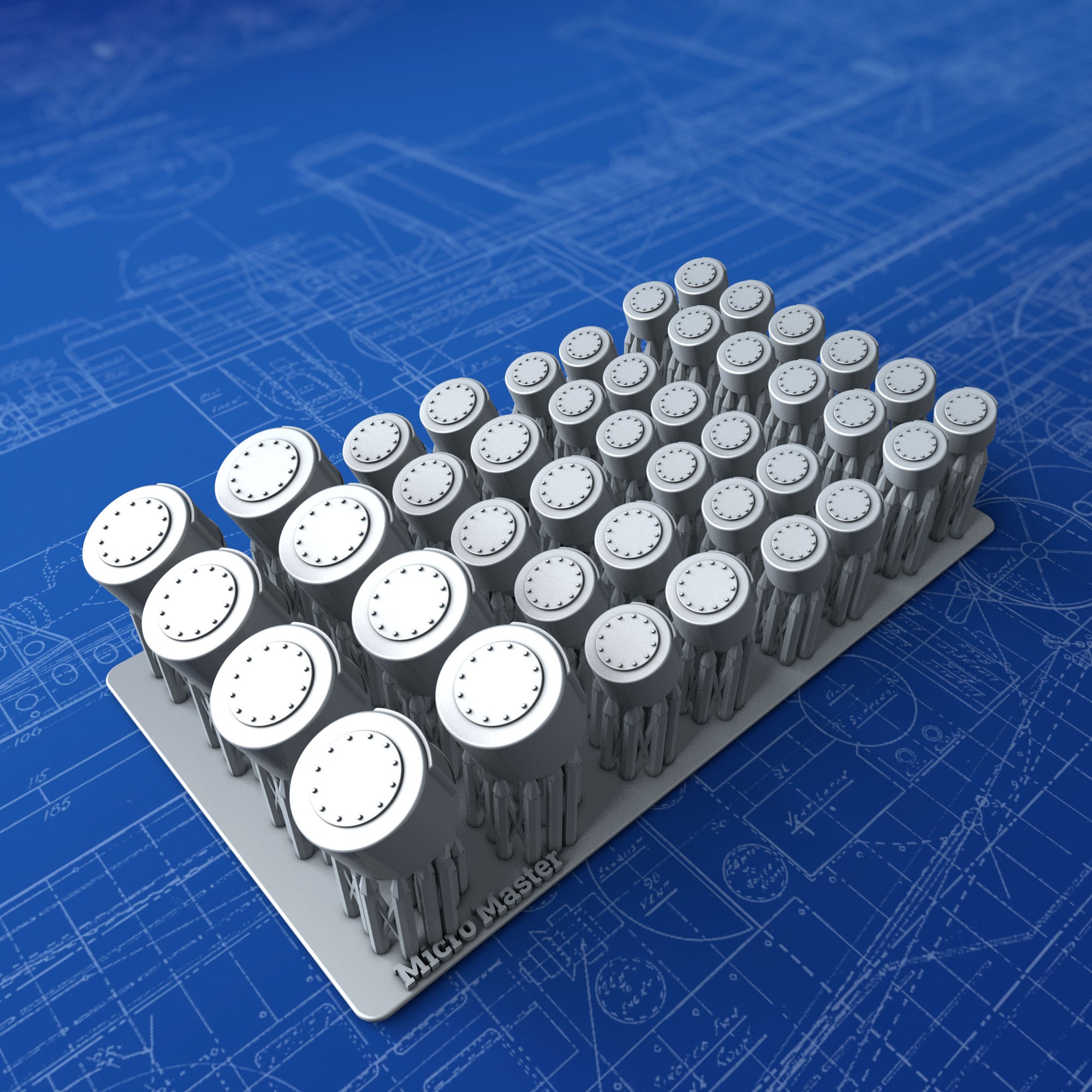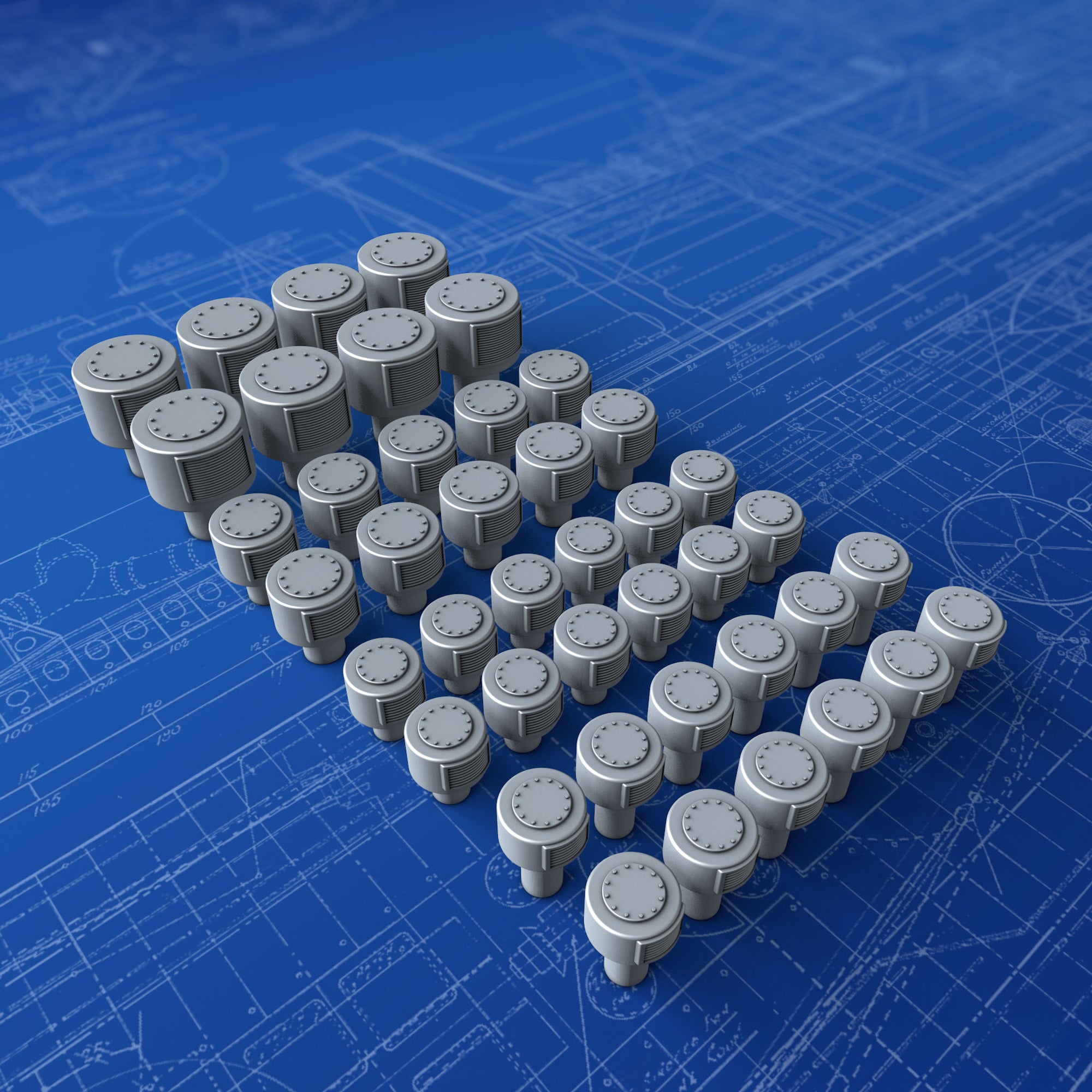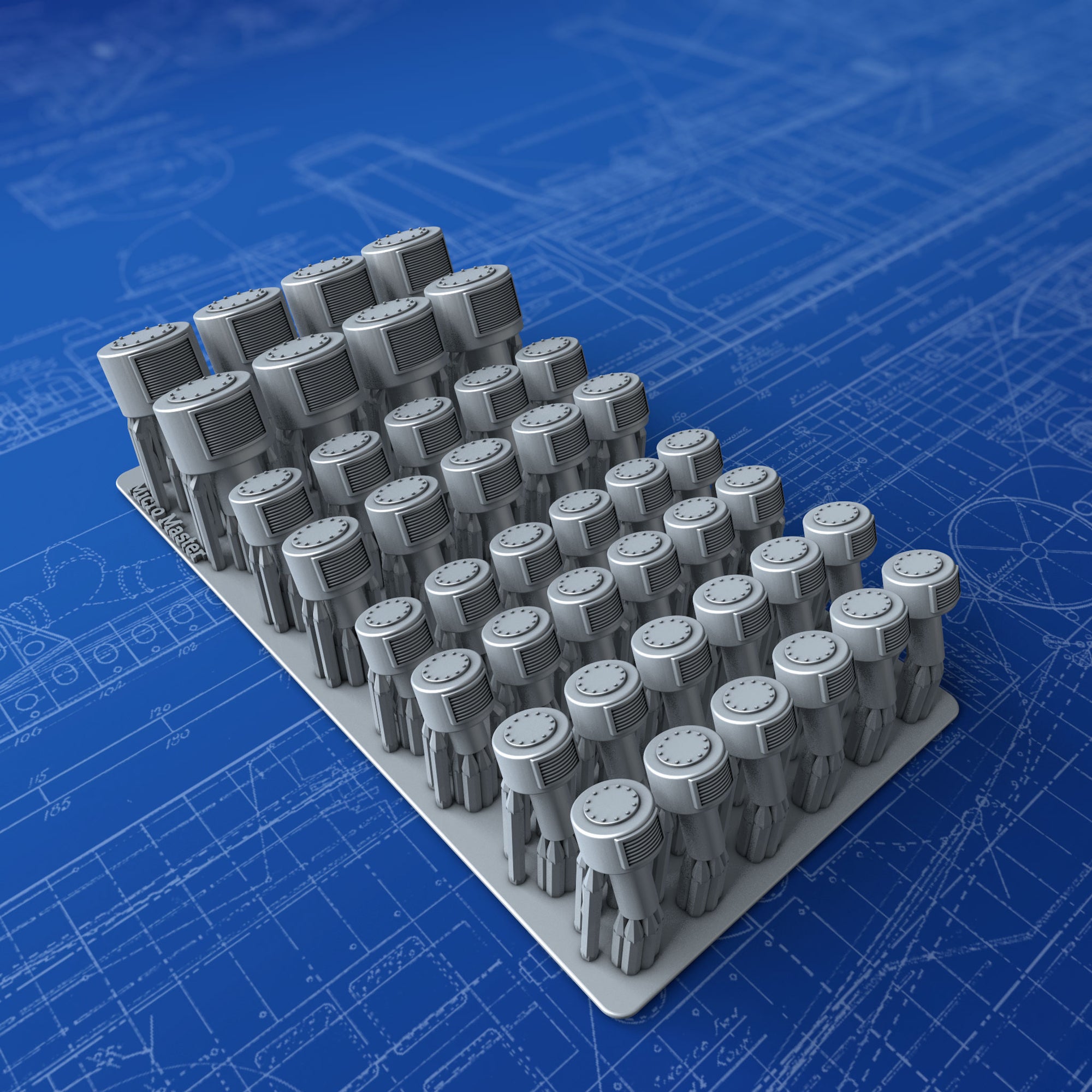 1/200 Royal Navy Large Mushroom Vents x42. Ideal for most WW2 Royal Navy Vessels. Accurately sized Mushroom Vents with Hex Nuts on roof and Vent with grills on side.