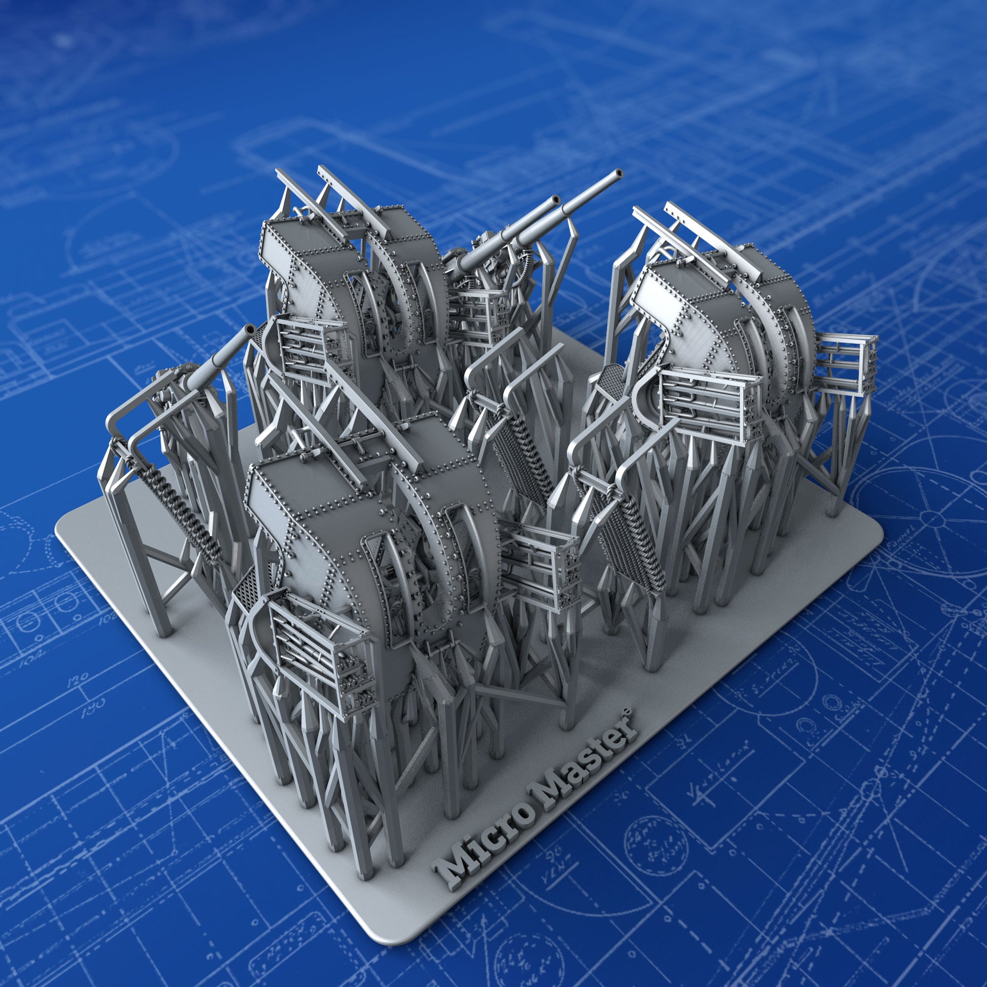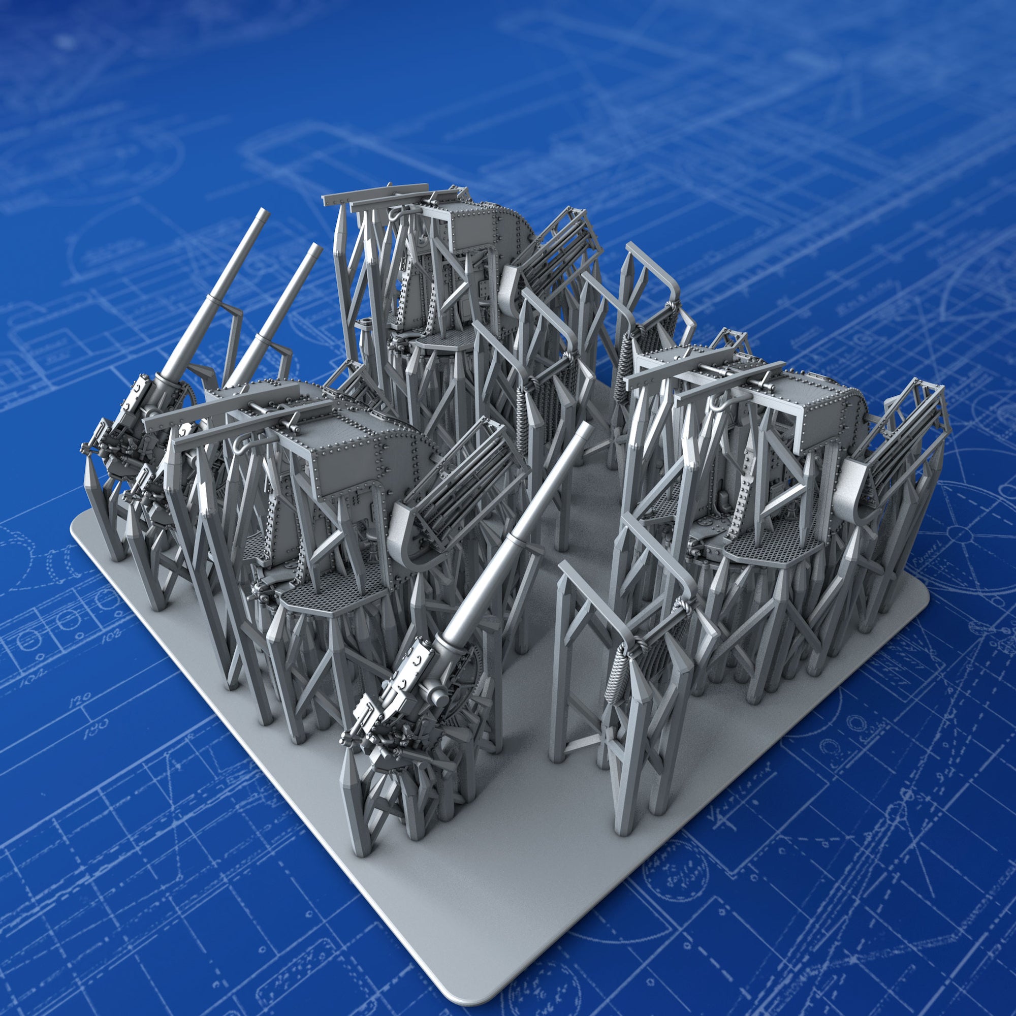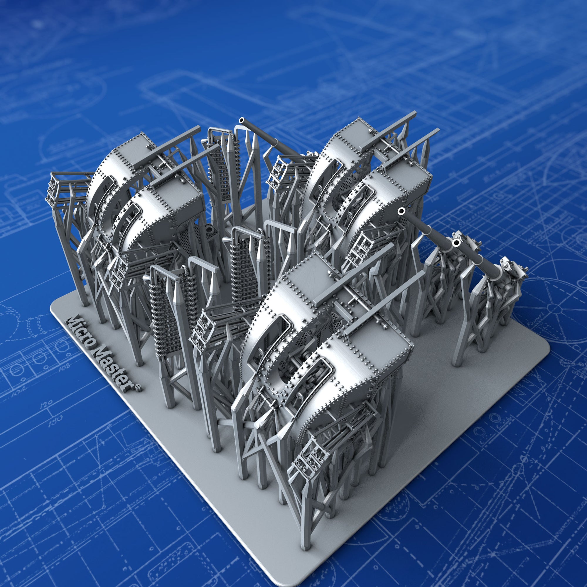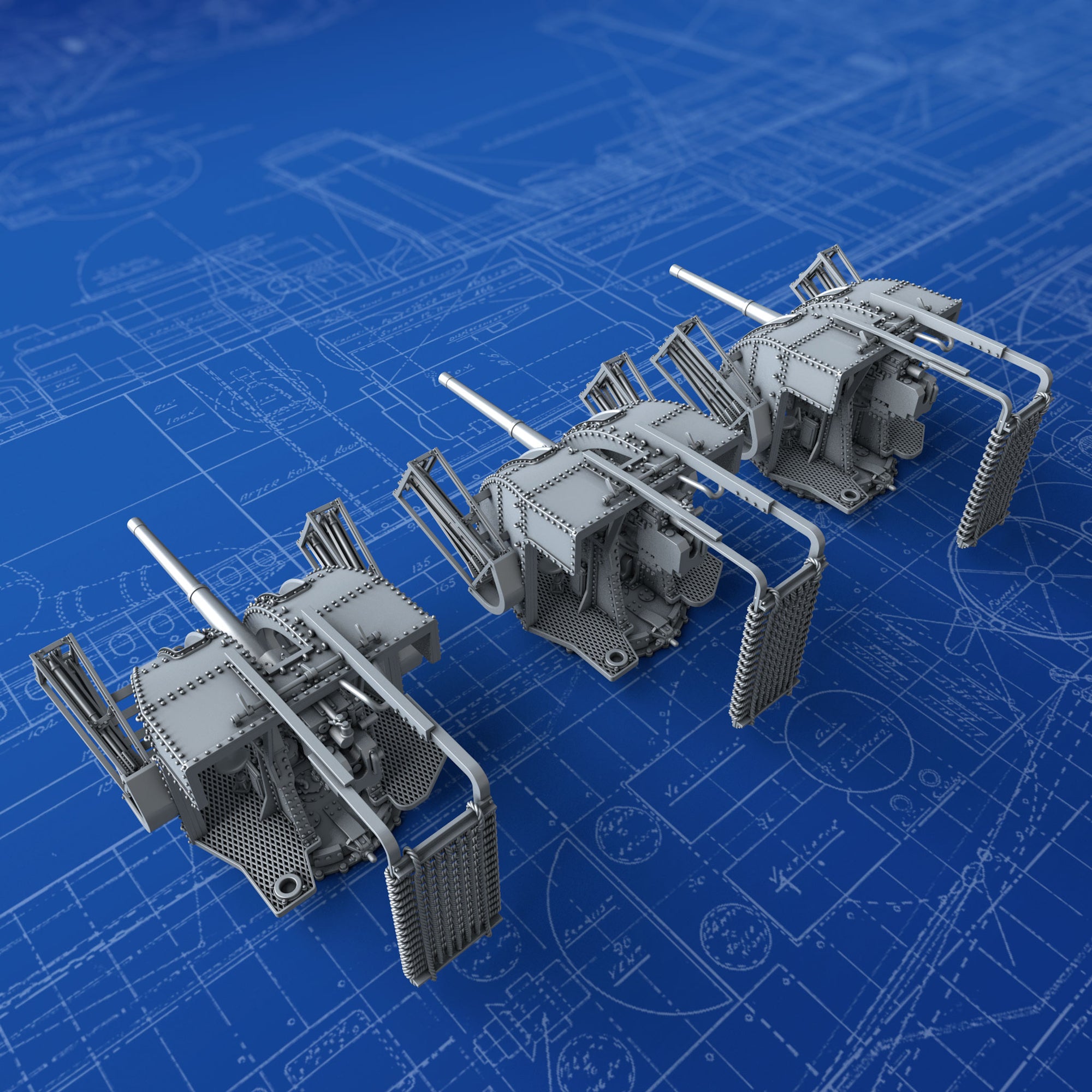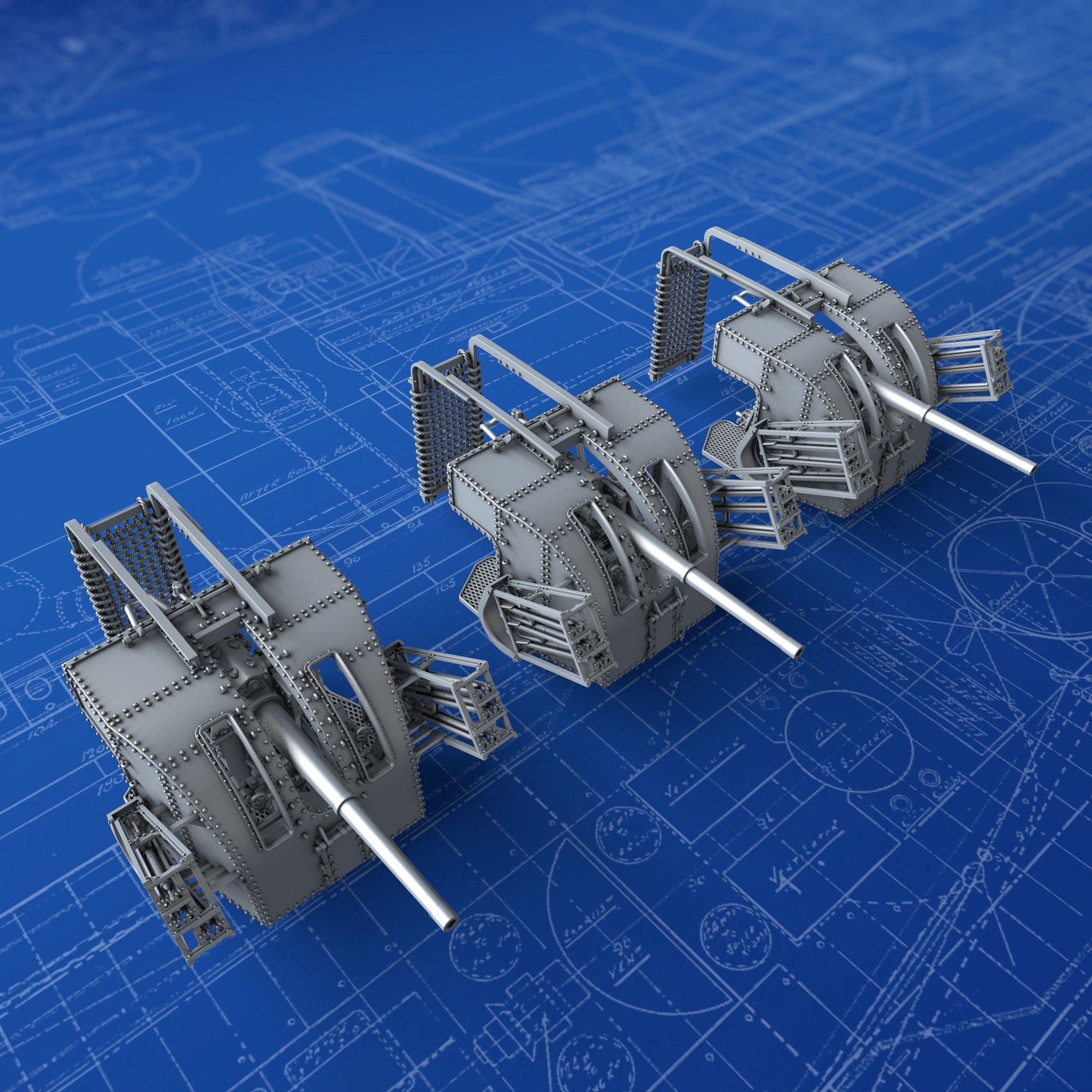 1/350 Scale Royal Navy 4"/45 (10.2cm) QF MKXVI (MKXX Single Mounts with 2" Rocket Flare Launcher) x3 as used by the Royal Australian Navy. Extremely detailed guns modelled from plans, reference photographs and surviving examples. These are the most detailed and accurate 3D printed 4"/45 (10.2cm) QF MKXVI (MKXX Single Mounts) available anywhere.
