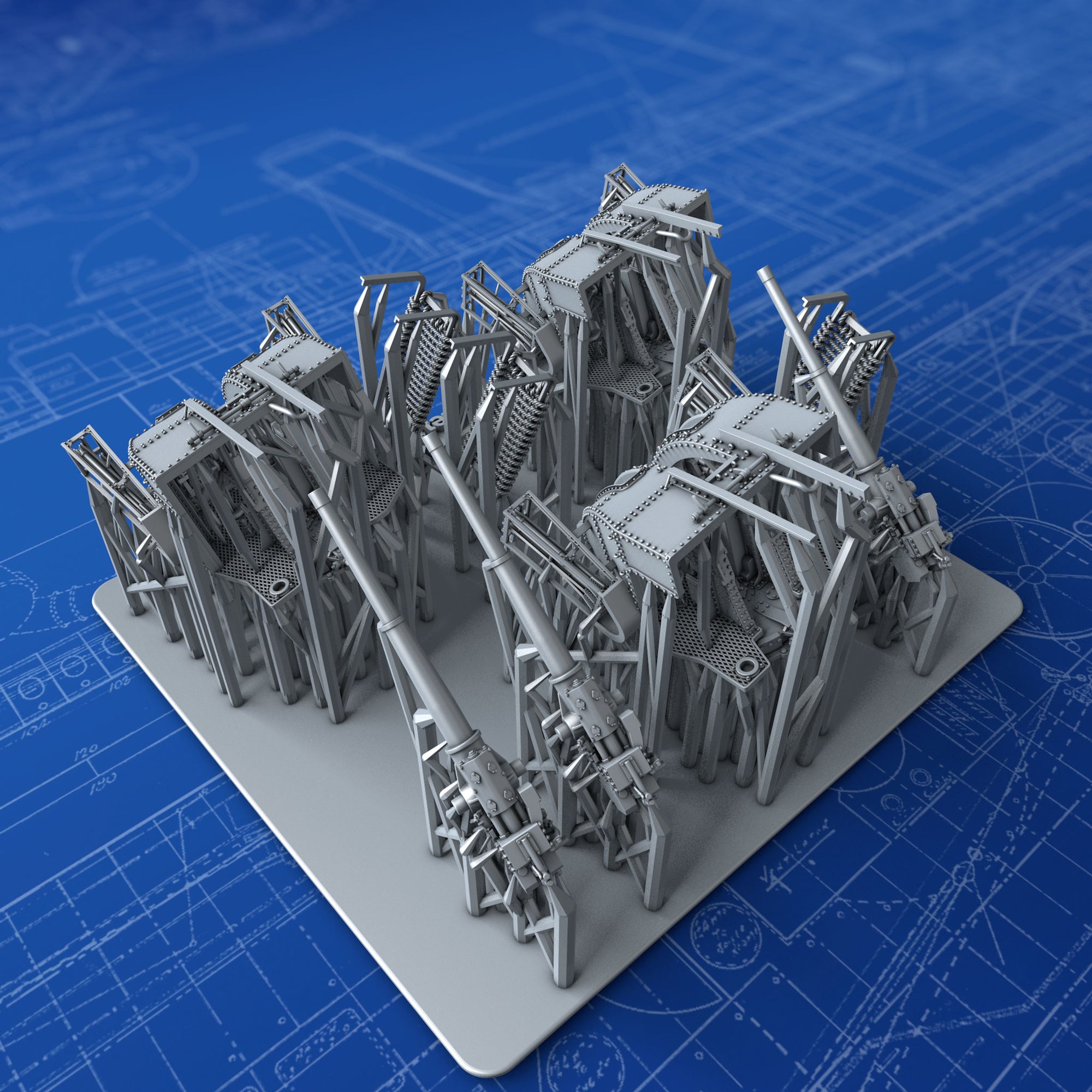 - 3x Mounts (3x Parts per Mount: 1x Mount and Gunshield, 1x Barrel and 1x Shell Net which can be omitted if desired)
