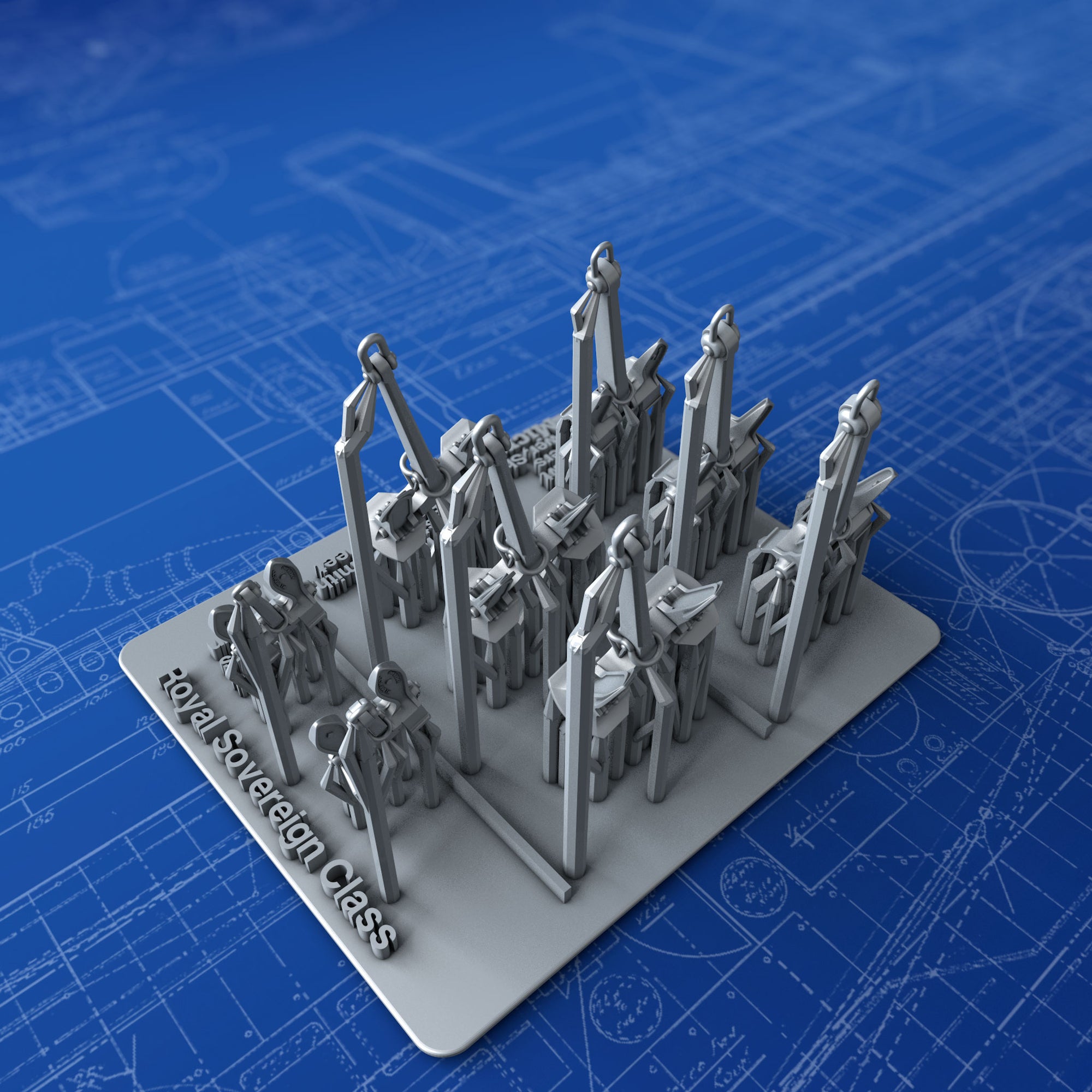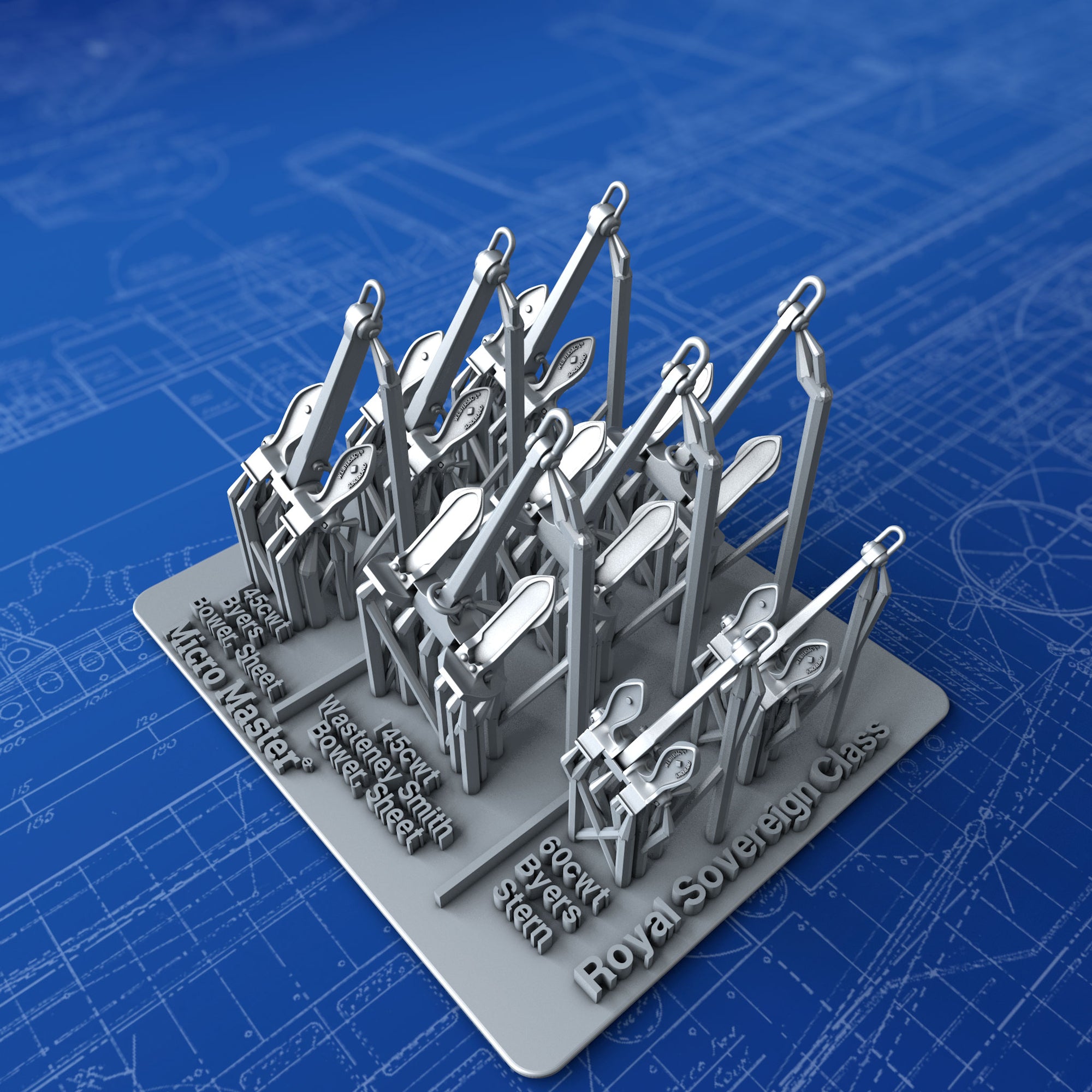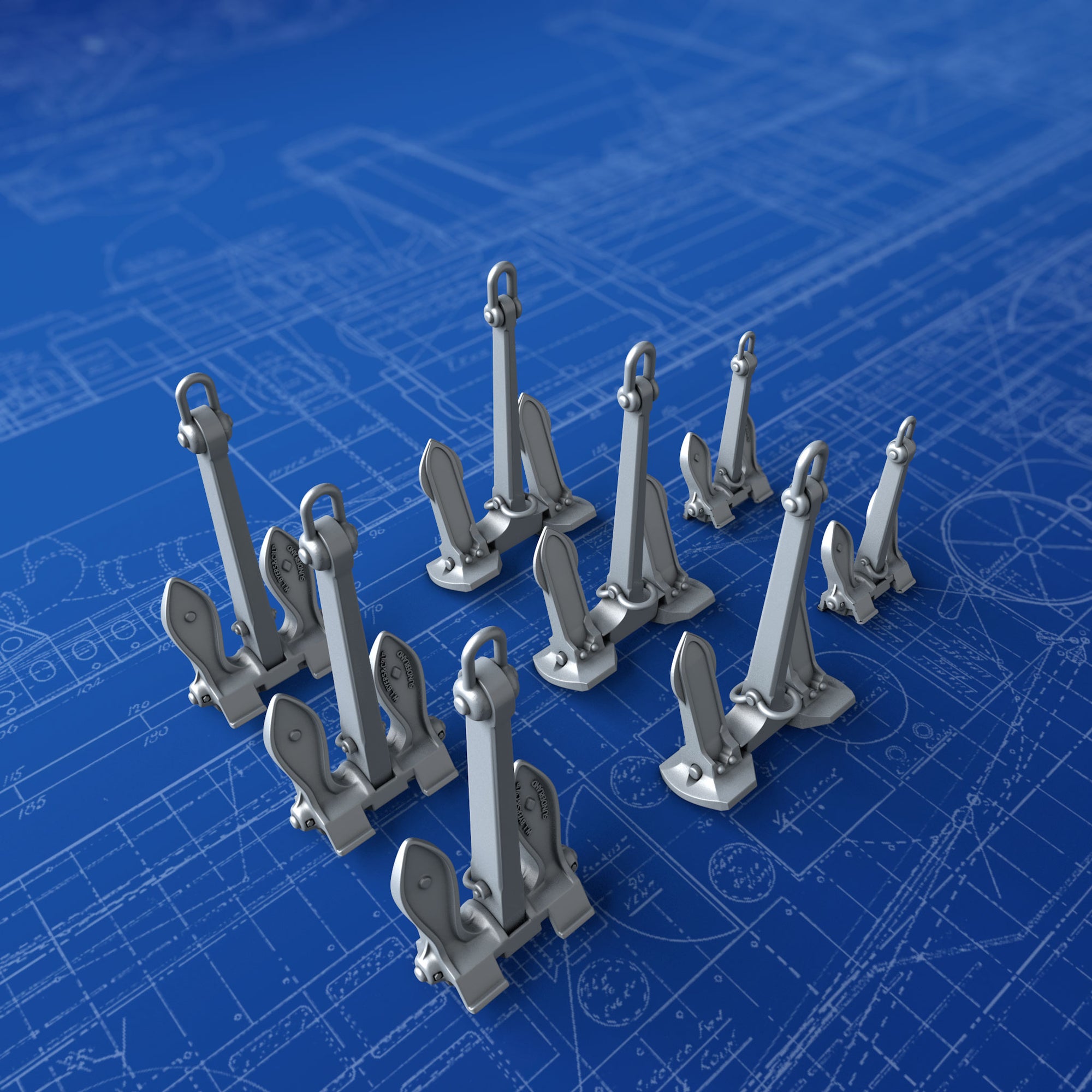 1/350 Royal Navy Royal Sovereign Class Battleship Anchor set, contains 2x different types for different ships of the class. Highly detailed model parts, modelled from the Norman Ough set of Anchor plans and using the size chart for accurate sizing. No more flat photo etch Anchors! Set contains 3x 145cwt Byers Anchors (Bower, Sheet), 3x 145cwt Wasteney Smith Anchors (Bower, Sheet) & 2x 60cwt Byers Anchors (Stern). Ships of this class carried carried either the Byers or the Wasteney Smith type anchor, please check your reference. Enough Anchors for 2 ships (if different anchor types were carried) e.g HMS Resolution carried Byers type whilst HMS Royal Oak carried Wasteney Smith type anchors.