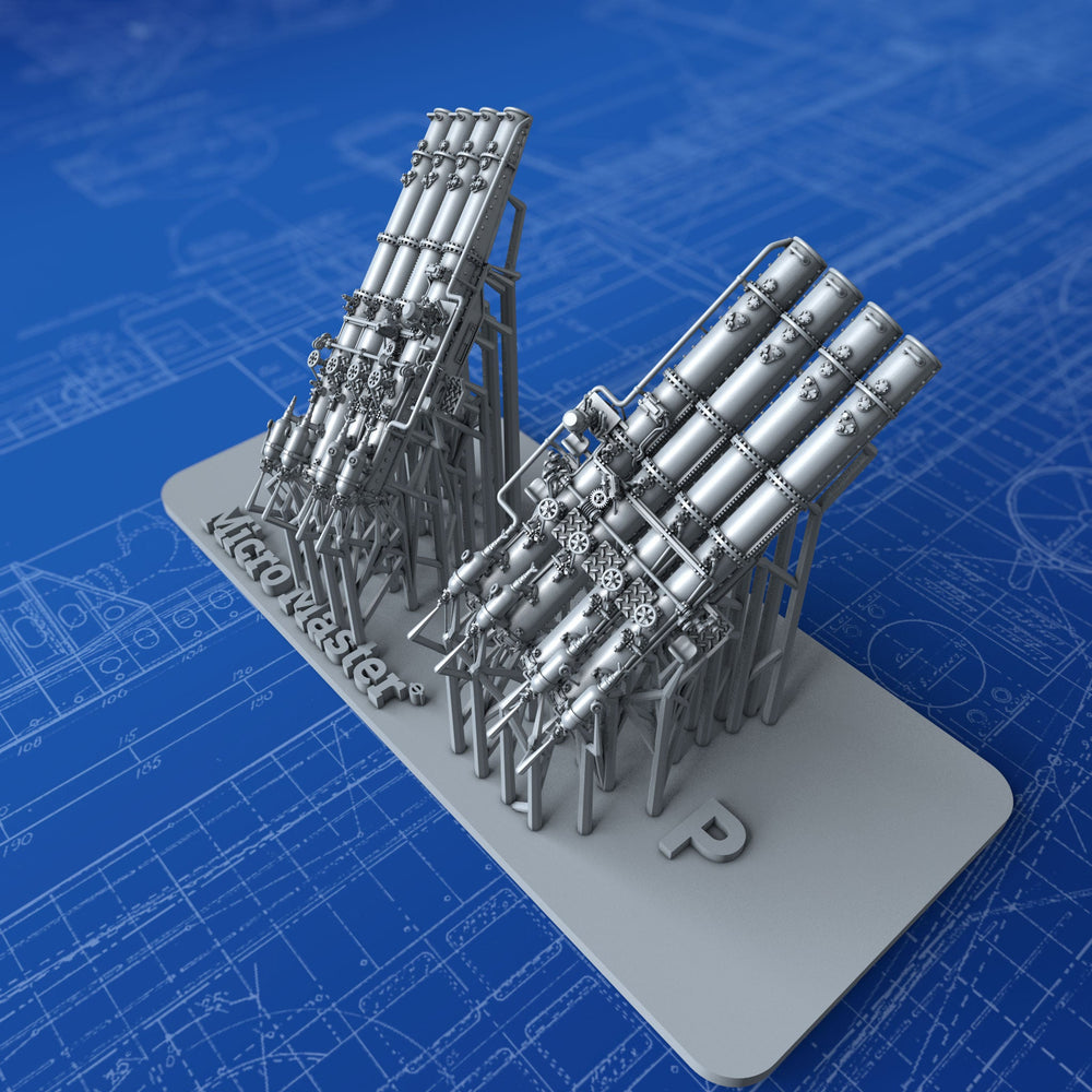 1/600 Royal Navy 21" QR MKIV Quad Torpedo Tubes x2 for Leander Class Cruisers. The amazing details on these torpedo tubes have been modelled using John Lambert plans and photographic reference. These tubes were used on the Leander Class Cruisers HMS Leander, HMS Orion, HMS Ajax, HMS Neptune & HMNZS Achilles. These are slightly different than the MKVII Tubes used on the later Modified Leander Class Cruisers. Ideal for the Airfix 1/600 HMS Ajax.